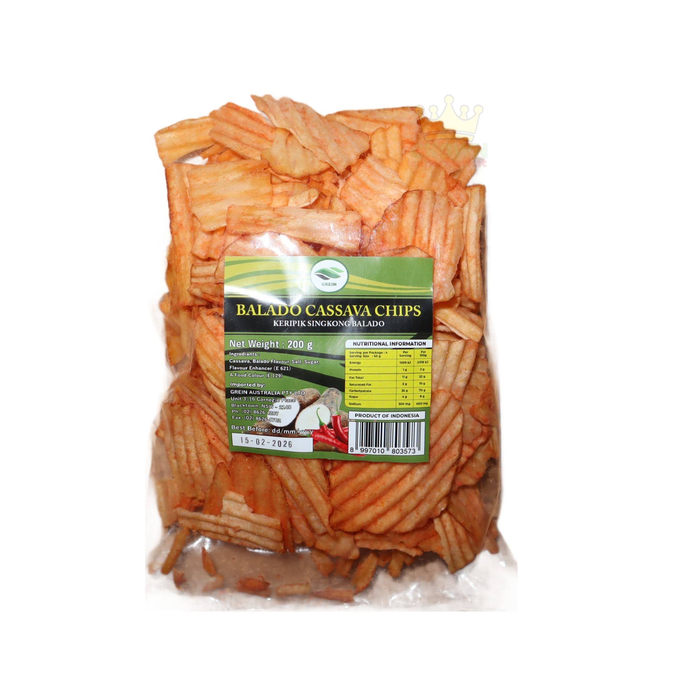 Turn up the heat and the crunch with Grein Balado Cassava Chips 200g, a bold snack that brings the fiery flavors of Indonesia right to your fingertips. Made from thinly sliced cassava root and fried to golden perfection, these chips are generously coated in traditional balado seasoning—a spicy, tangy blend of chili, garlic, and sweet undertones that hits all the right notes.